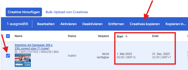 3.2 Creative hinzufügen anklicken und den neuen Banner hochladen inkl. angegebenen Link, sollte ein neuer geliefert worden sein